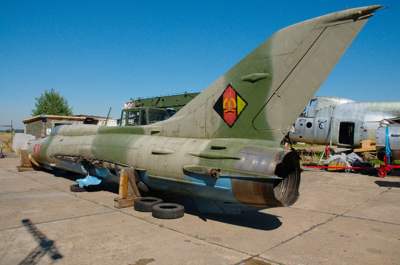 Die MiG-23 scheint noch ein Geheimnis zu bergen. Bei genauerer Betrachtung scheint man Ihr ein komplett neues Heck verpaßt zu haben. Die Farbgebung ist sehr unterschiedlich, das Heck ist nicht nur komplett russisch beschriftet (im Gegensatz zum Rumpf, der eine gemischte Beschriftung trägt), es hat auch andere Farben (die original russischen, wie es scheint) und die Grenzen von hellblauer Lackierung unten und braun/grüner oben sind zwischen Heck und Rest sehr unterschiedlich.