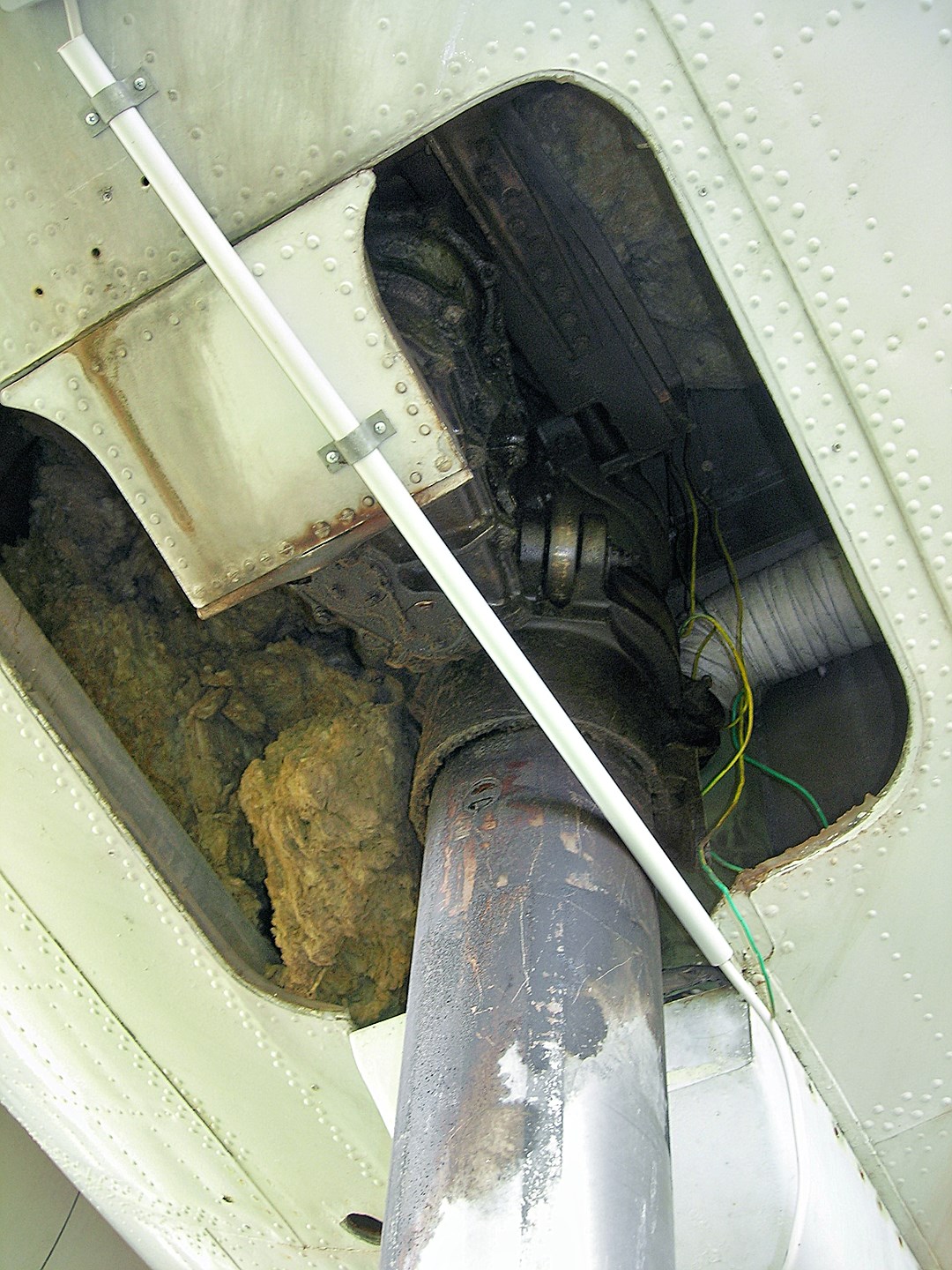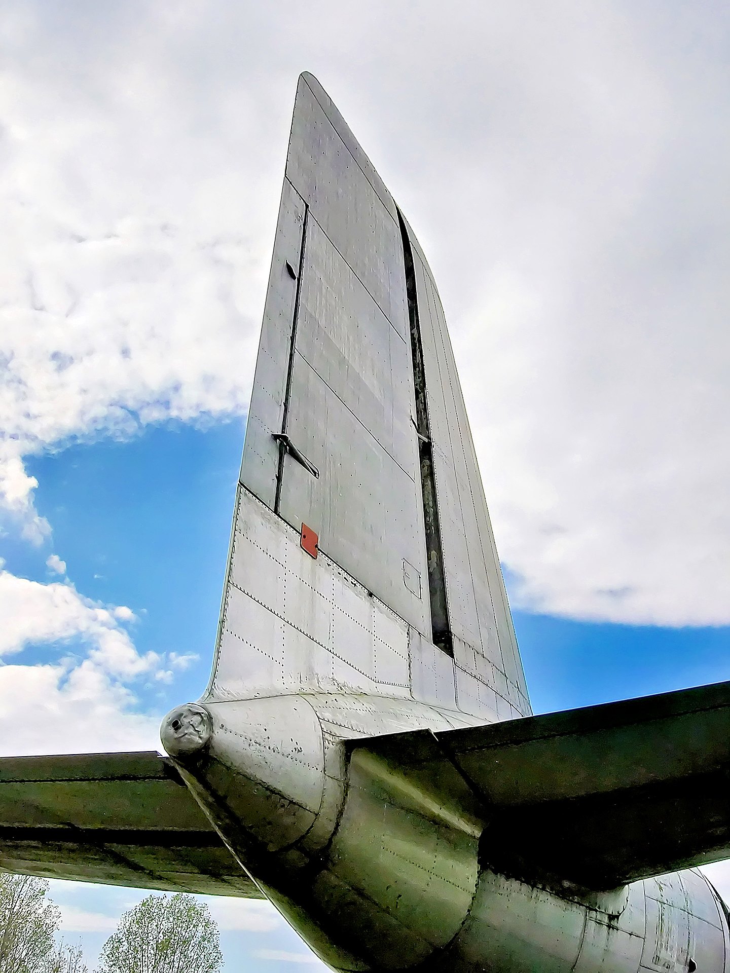 Dieses Foto läßt gut erkennen, wie die Antenne (Spitze der Leitwerkskeule) vom Rest der Flugszeugstruktur elektrisch isoliert wurde. Das graue Segment besteht aus einem nichtleitenden Kunststoffmaterial.