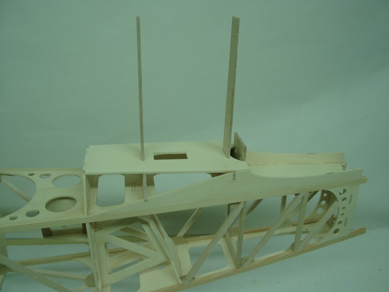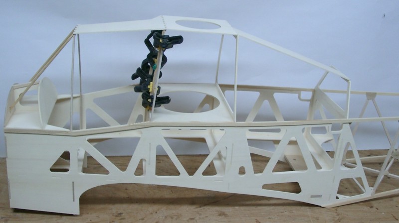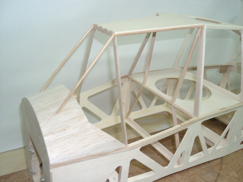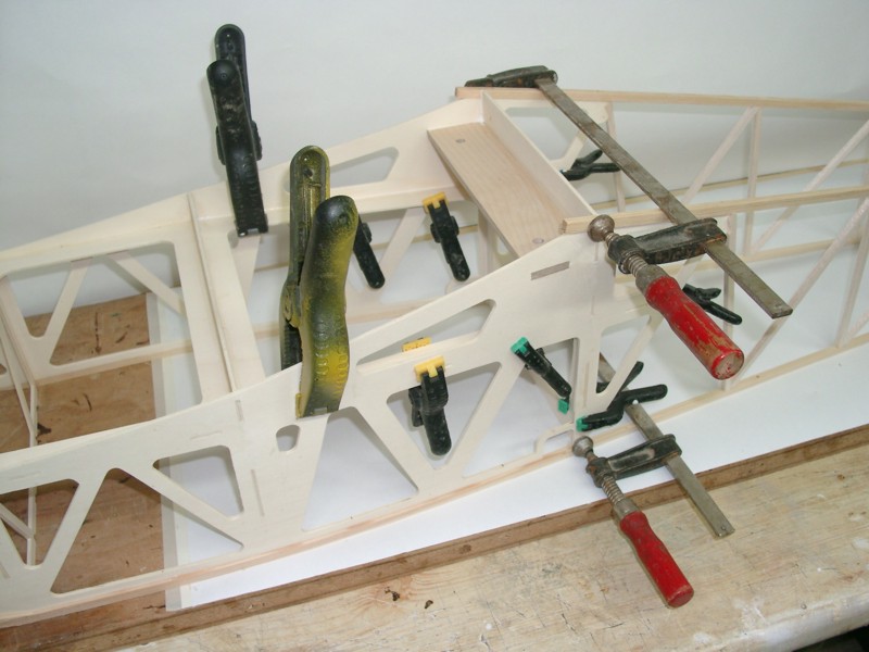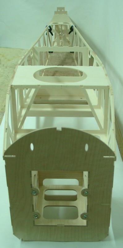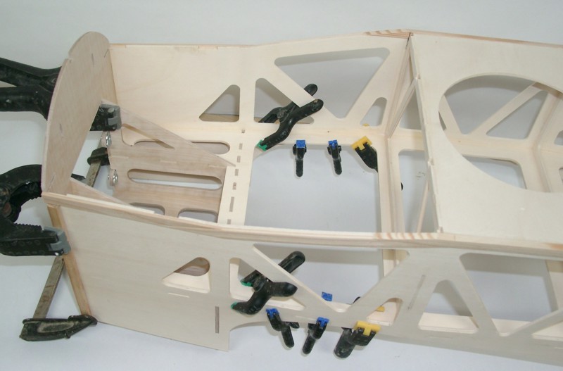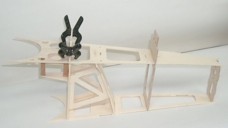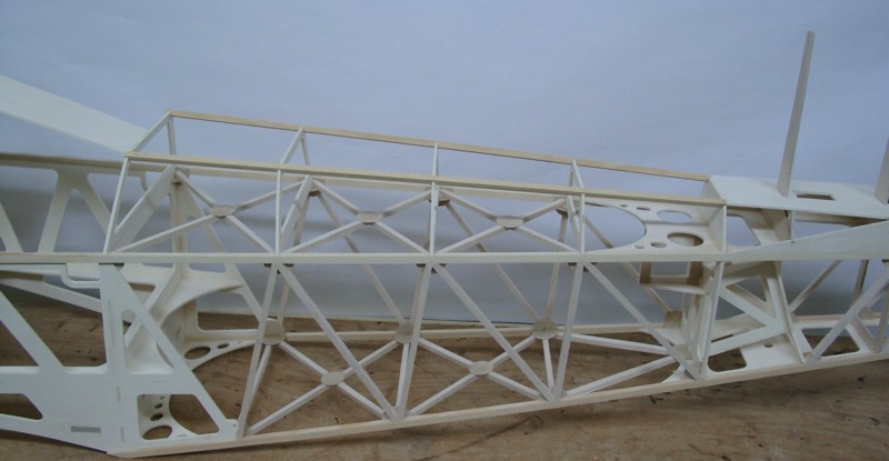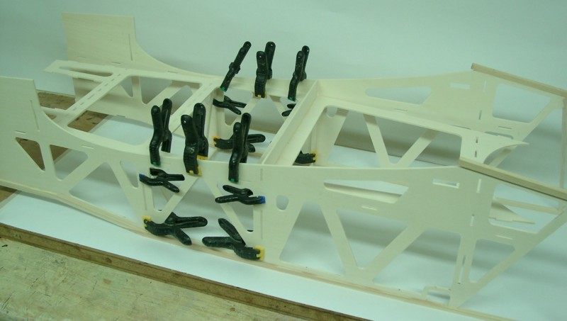 Nun geht es weiter mit dem Rumpf: Beide Leitern werden auf dem Rücken liegend zu einem Kasten verbunden. Wenn alle Teile dran sind, ergibt sich ein torsionssteifes Bauteil.