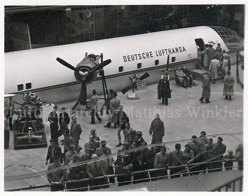 Das sieht aus wie das "Messe-Cafe" der Lufthansa (Stewardess am Eingang, Preistafel in der Bildmitte). Es steht aber auch museales Zeug herum.