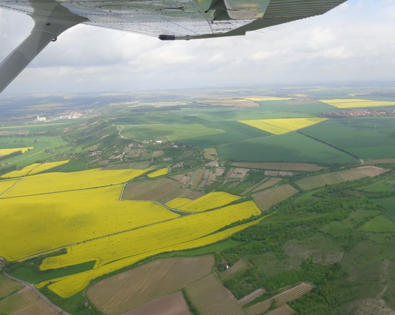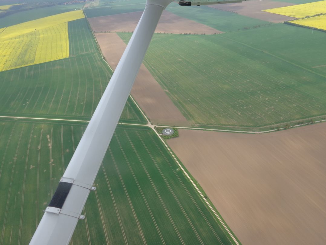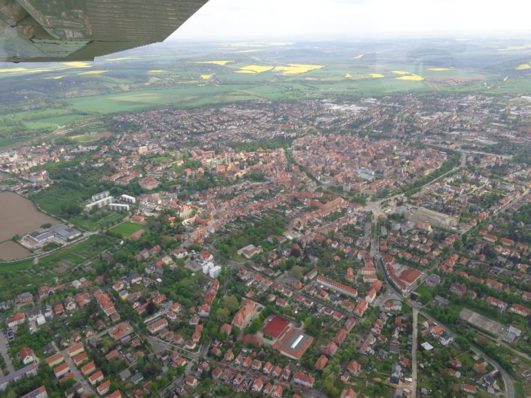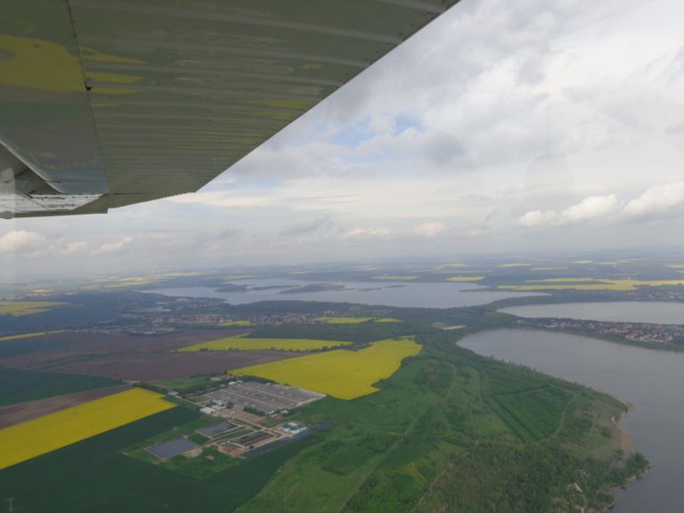 Da sind wir hinter Merseburg über der Seenlandschaft der ehemaligen Tagebaulöcher- im Hintergrund Braunsbedra.