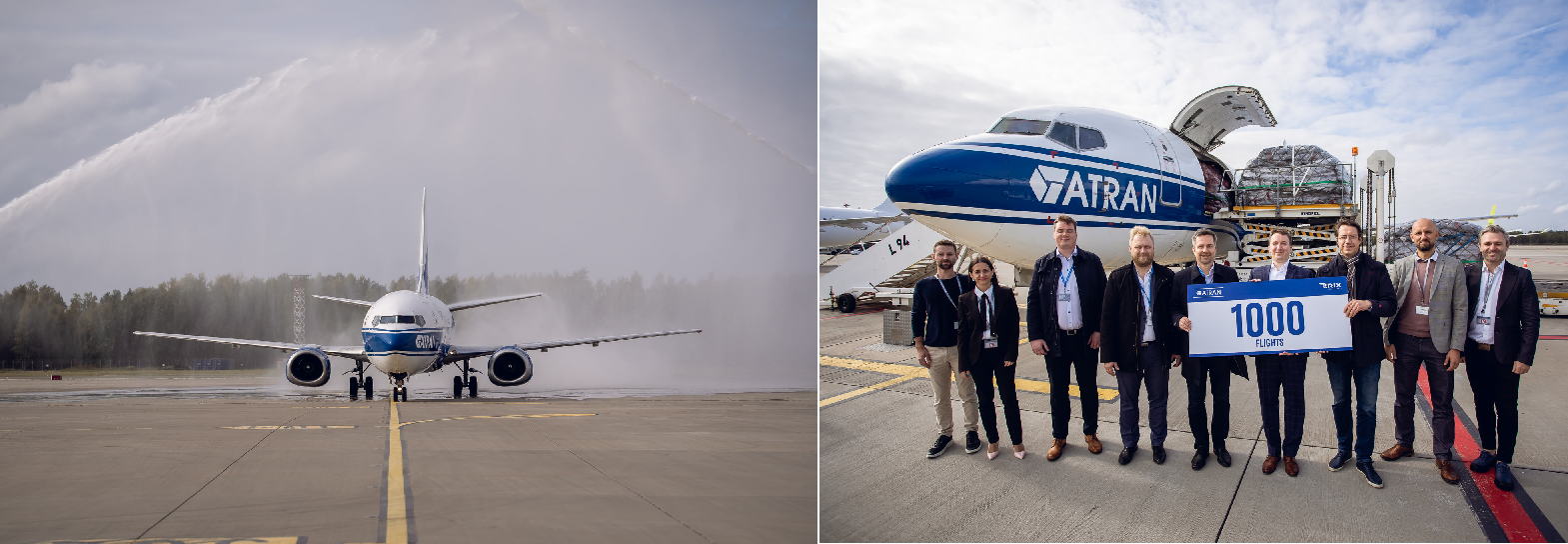 Atran Airlines landete heute, am 29. September, seinen 1000. Flug auf dem Riga International Airport mit über 20 Tonnen E-Commerce-Lieferungen aus China kommend an Bord einer Boeing 737-800 BCF .