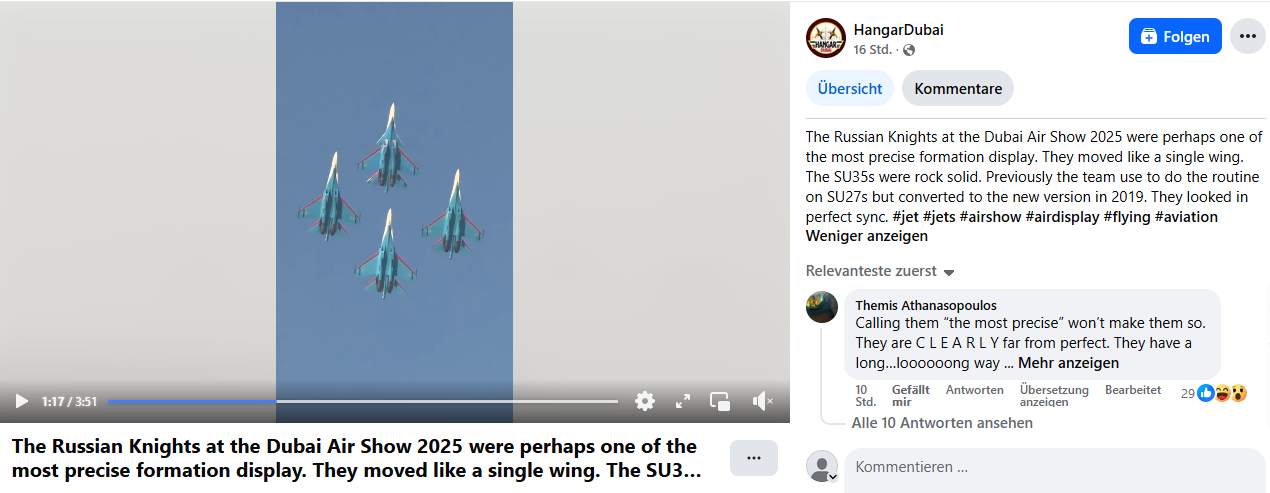 ... und bemerkt dazu: "Die Russian Knights auf der Dubai Air Show 2025 waren vielleicht eine der präzisesten Formationsvorführungen. Sie bewegten sich wie ein einzelner Flügel. Die SU-35 waren absolut zuverlässig. Früher machte das Team diese Routine auf SU-27s, wechselte aber 2019 auf die neue Version. Sie sahen perfekt synchron aus".