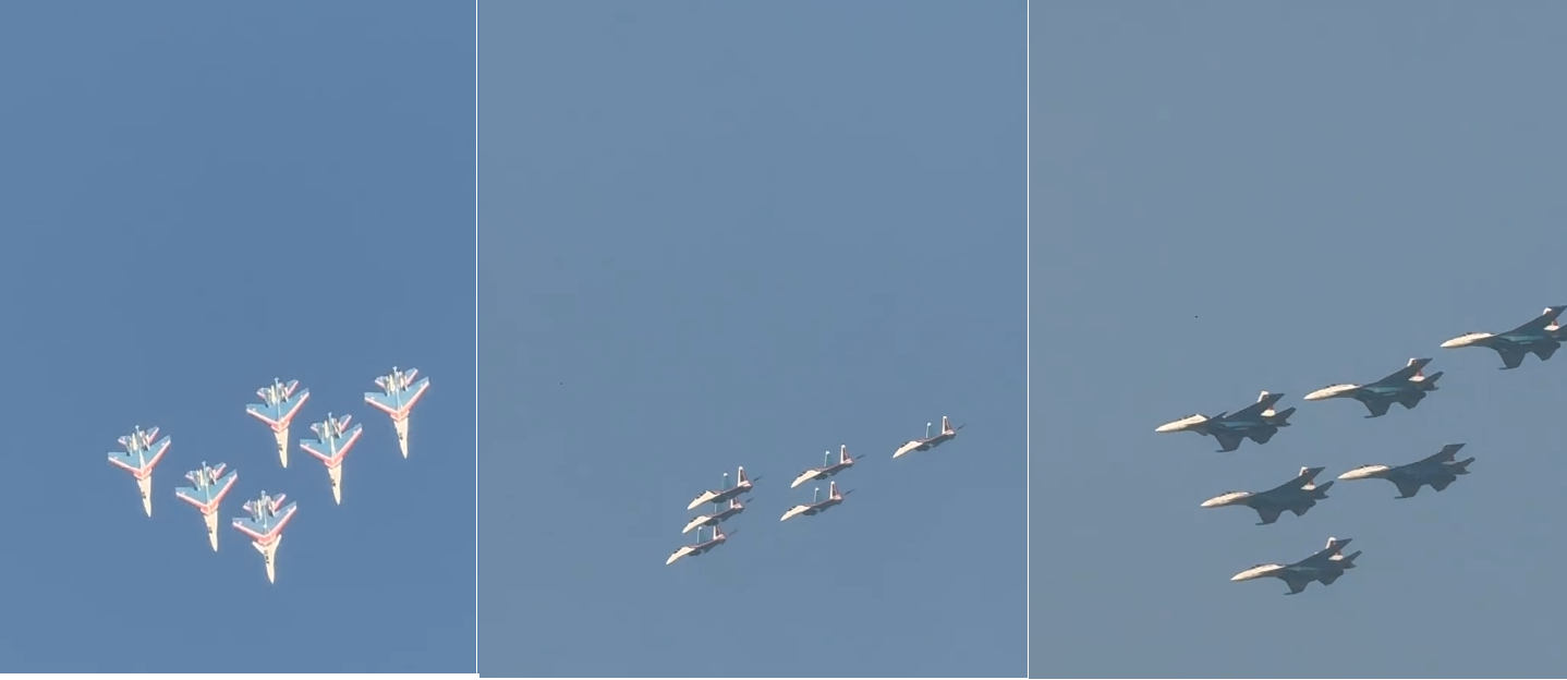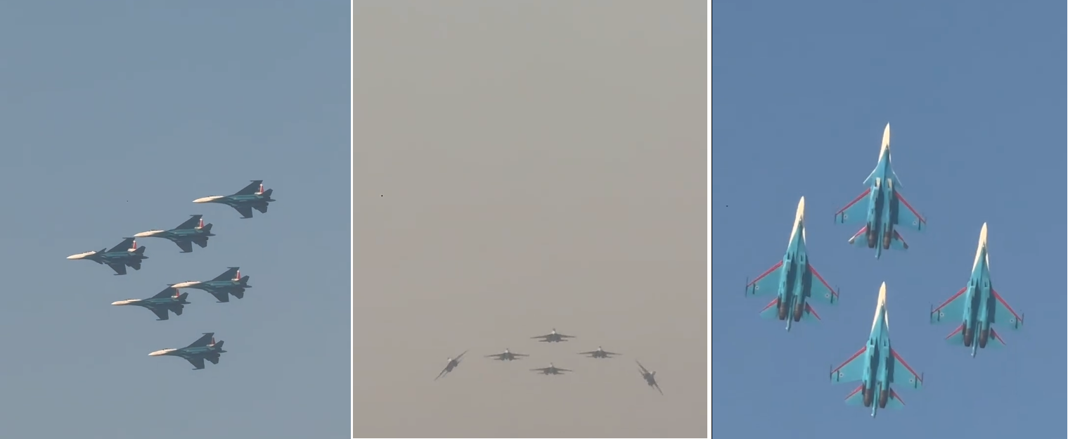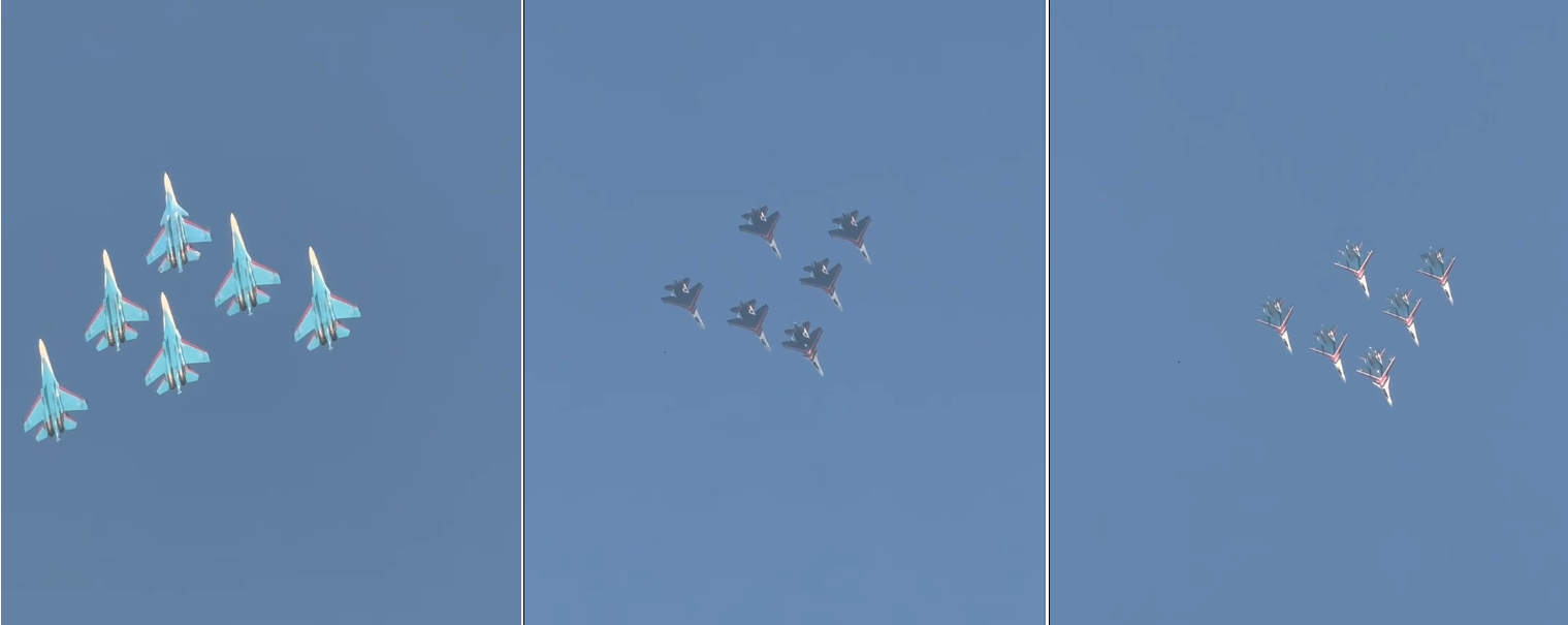 - Die Kunstflugstaffel "Russische Ritter" zeigten Gruppenkunstflug, wie z.B. "Nesterov Loop", "Barrel", "Turn" in festgelegten Intervallen und Distanzen, sowie Paar-, Einer- und Gegenkunstflug.
