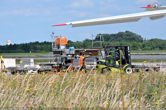Zunächst wurden die Propeller der linken Seite (gesehen in Flug/Fahrrichtung) demontiert. Inzwischen wurden diese am 07.07.2016 vormittags wieder an das Flugzeug montiert. Nachdem die linke Seite wieder komplettiert war, erfolgte die Demontage der Propeller der rechten Seite.