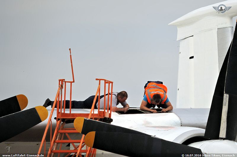 Einige Tage zuvor geisterte die Meldung herum, dass wohl am 16.07.2016 ein Testflug nach der Propellerwartung duchgeführt wird. Dafür sprach der Umstand, dass die Maschine wieder vollständig über ihre Propeller verfügte. Da Ferien sind, versuchte ich mein Glück und stiegt am Samstag zeitig in den Zug nach Leipzig. Als ich nach 3 Stunden am Flughafen ankam, war man schon am Flugzeug zugange. Und es wurde ein Krimi. Es geisterten diverse verschiedene Flugzeiten herum. Zudem verschiedene Flugdauern. Aber, letztendlich flog die UR-09307 tatsächlich, auch wenn es am Ende wohl noch ein paar Probleme geben wird.