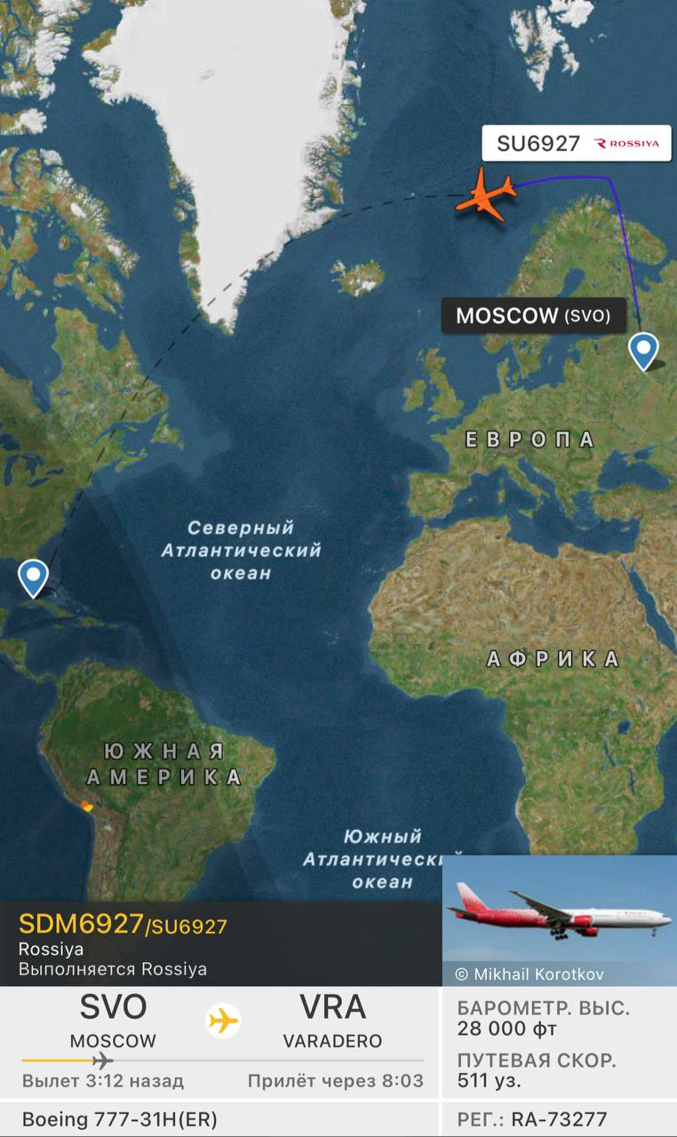 Rossiya Airlines begann mit Flügen nach Kuba (Varadero) mit einer Boeing 777-300ER. Die Route ist insofern interessant, als über dem Atlantik, und das ist die Hälfte der Strecke, die Flugzeuge auf sehr niedrigen Ebenen von FL280 fliegen und Nordwind in die gleichen Richtungen manchmal FL260 und sogar FL240 einnimmt, also Höhen im Bereich von 7000 bis 8000 Meter. Flugzeuge anderer Fluggesellschaften fliegen deutlich höher über dem Atlantik. In der Regel von FL340 bis FL400 (10.360 – 12.200 m). In der umgekehrten Richtung ist die Situation dieselbe. Flugzeuge besetzen die unteren Ränge, nur ungerade (z. B. FL270).