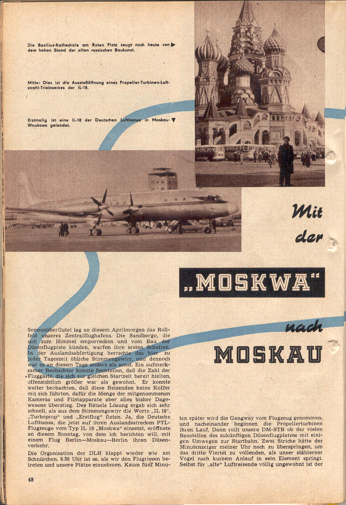 mit der IL-14 habe ich keinen Moskauflug entdeckt. Dafür aber mit der IL 18. Der Erstflug der IL-18 der DLH im Linienverkehr nach Moskau Wnukowo. Beschrieben in der "Jugend und Technik" Juni 1960. Als Besatzung sind genannt: