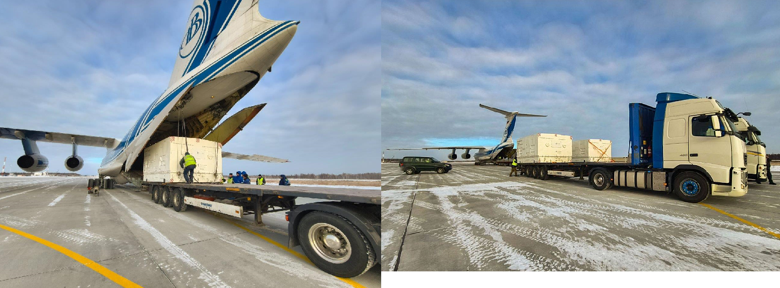 ... entladen und die Container mit den Satelliten und Hilfsausrüstung zum technischen Komplex des Kosmodroms zur Startbearbeitung geliefert.
