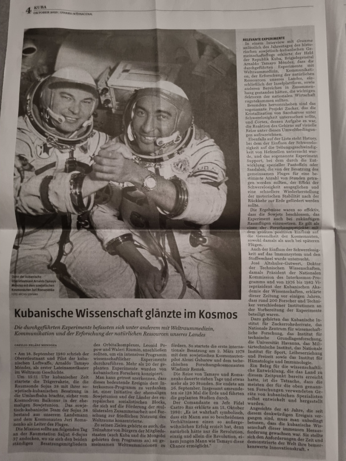 In der aktuellen (deutschsprachigen) Ausgabe der kubanischen Zeitung "GRANMA" würdigt man in einem ganzseitigen Artikel den Einsatz von Teniente Coronel (Oberstleuntnant) Arnaldo Tamayo Mendez an Bord von Sojus 38 im INTERKOSMOS-Programm.