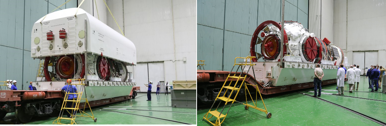 Inzwischen wurden die Transportcontainer zum Montage- und Testgebäude des Standortes Nr. 254 transportiert. "Dort werden die Spezialisten der S. P. Korolev Rocket and Space Corporation Energia (Teil der Roscosmos State Corporation) mit dem Entladen von den Bodentestgeräten und dem Modul selbst beginnen,