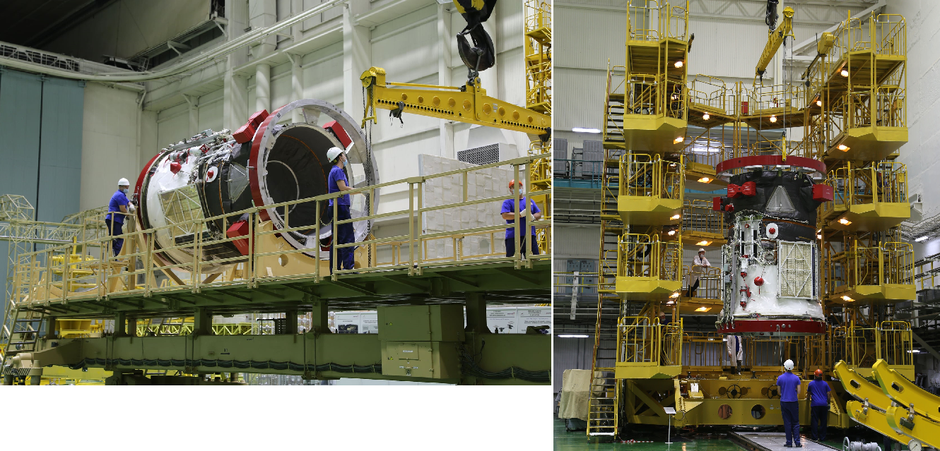 Der Tiefladewagen mit dem Thermocontainer wird geöffnet: die Hallentransportsysteme übernehmen zu den Montage- u. Prüfständen Q.: RSC Energija/Roskosmos https://www.roscosmos.ru/32159/