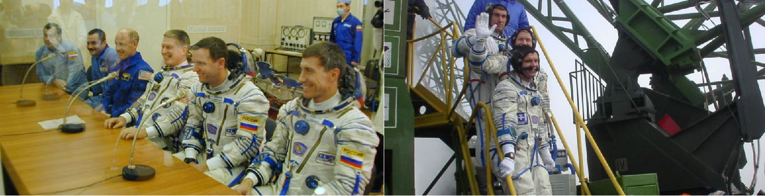 Links bei der theoretischen Vorbereitung zum Flug so kennt man ihn, und rechts Verabschiedung vor dem Flug von seinen Begleitern Bildquelle: https://www.roscosmos.ru/32505/