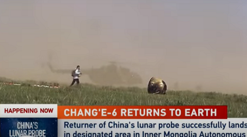Das Rückkehrfahrzeug der Mondsonde Chang'e-6 um 06:07 UTC (= 09:07 Uhr MOZ) landete erfolgreich in der Autonomen Region Innere Mongolei.