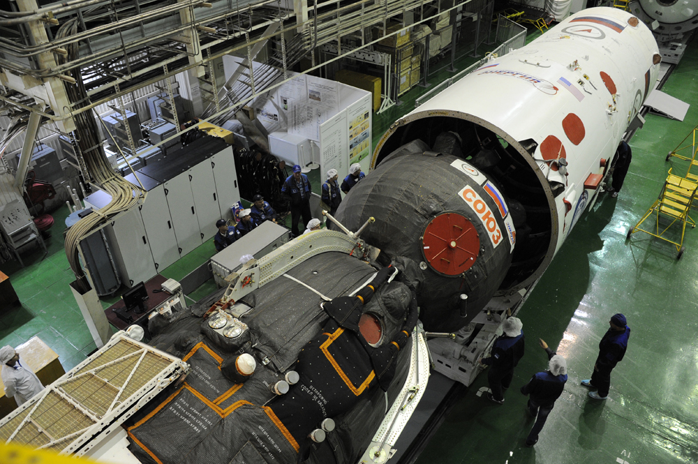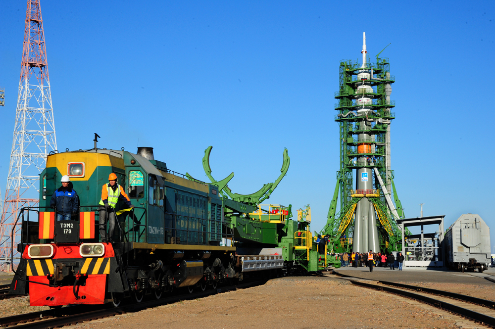 und zeigt den Startplatz Arbeitsplatz seitig - die Sojus dampft so vor sich hin