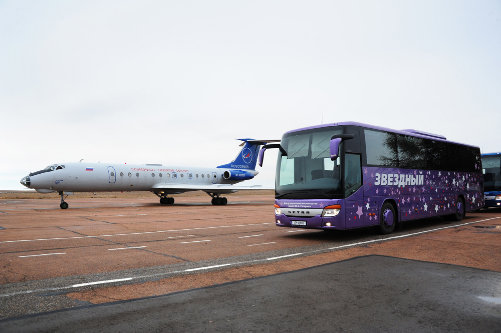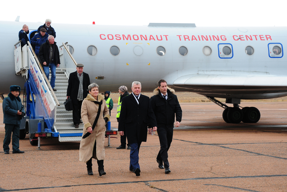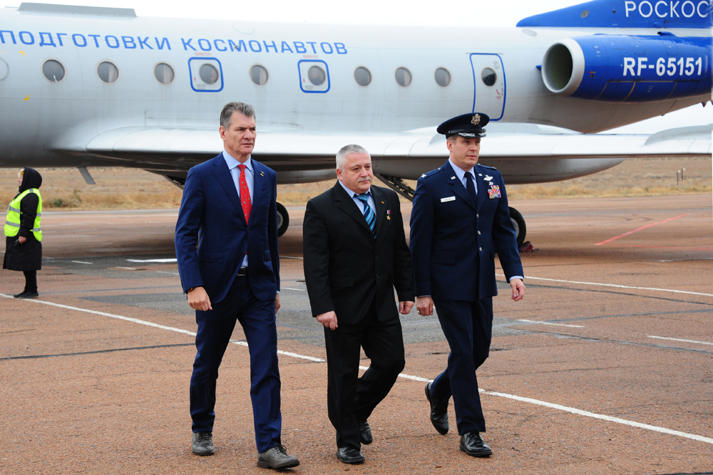 Die Crew Sojus MS-03 sowie die Doublés schweben zu ihrer Mission ein