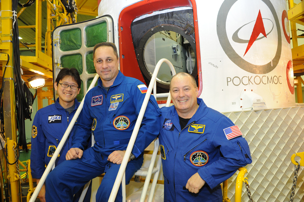 Die Stammcrew der Exp. МКС-54/55 - космонавт РОСКОСМОСА Антон ШКАПЛЕРОВ, астронавт НАСА Скотт ТИНГЛ и астронавт ДжАКСА Норишигэ КАНАИ.