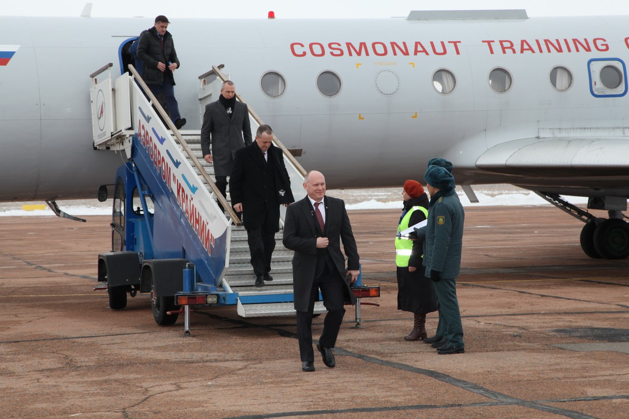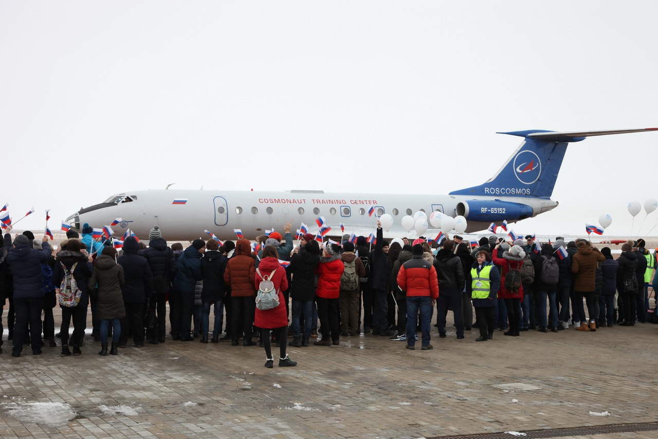 Nach 3 Stunden Flug über zwei Zeitzonen die Ankunft der ersten TU-134 des Kosmonauten-Ausbildungs-Centers in Baikonur: mit der Stammcrew Roskosmos-Kommandant Oleg Artemjew, die Flugingenieure Andrew Fojstel und Richard Arnold und die zweite TU-134 mit der Backup-Crew Roskosmos Alexej Owtschinin und Nasa-Astronaut Nick Hague Quelle alle Bilder: https://vk.com/roscosmos?z=photo-303153 ... 369_242801