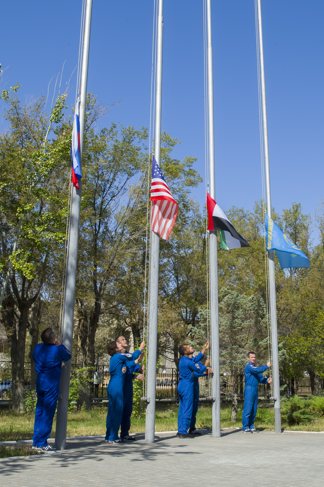 Oleg Skrypochka hob die russische Flagge, Jessica Meir und Thomas Marshburn hoben die US-Flagge, Khazzaa Al Mansouri und Sultan Al Neyadi hoben die Flagge der Vereinigten Arabischen Emirate, und Sergej Ryshikov hob die kasachische Flagge.