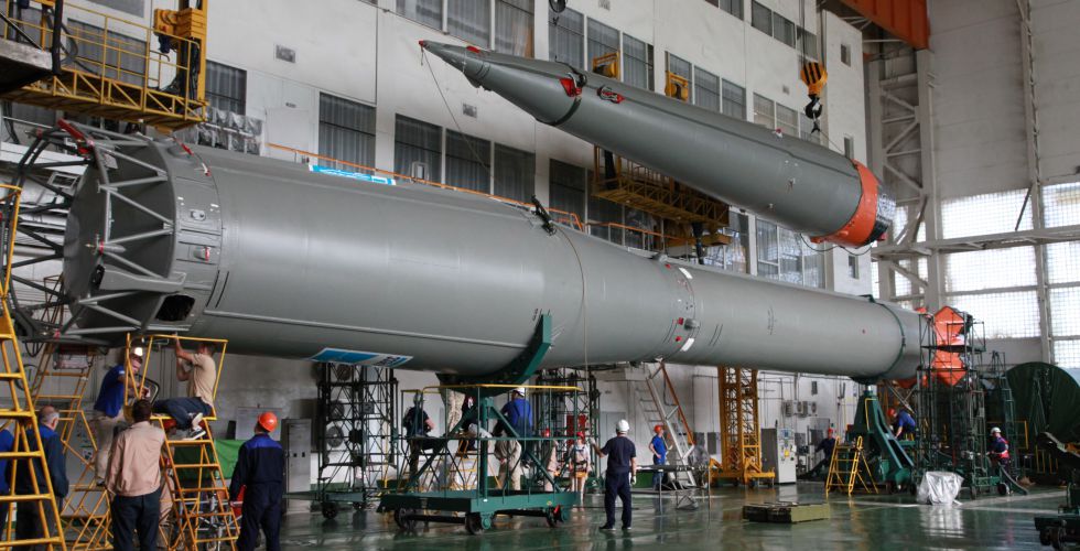 Gleichzeitig wurde die mechanische Montage des "Startpaketes" (Blöcke der ersten und zweiten Stufe) des Trägers Sojus-FG im Montage- und Testgebäude abgeschlossen. Wie schon gesagt - es ist der letzte Träger der Baureihe "FG"