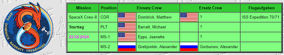 (Durch den außerplanmäßigen unbemannten Flug der Sojus MS-23 (am 20. 24. Februar) ergibt sich, daß die geplante Crew Oleg Kononenko, Nikolai Chub und NASA-Astronaut Oral O'Hara, erst im Herbst 2023 mit dem nächsten Raumschiff MS-24 zur ISS fliegen kann.