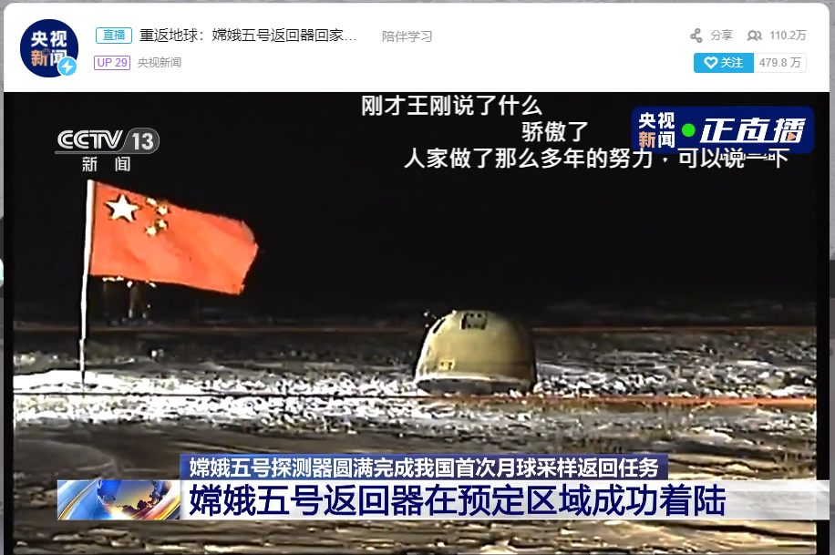 https://live.bilibili.com/21686237Großen Glückwunsch an die Chinesen zum Abschluß des Raumfahrtjahres 2020 - eine absolut runde wie reife Leistung in allen Dingen