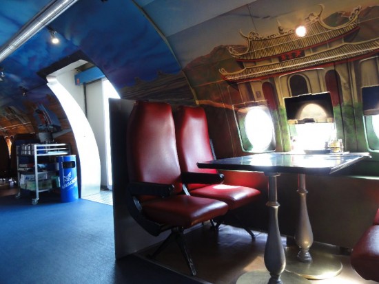 Innen ist das Flugzeug ebenfalls phantasievoll bemalt, jeder 4-er Tisch hat ein Thema, z.B. Australien, Indien, USA . Entsprechende Speisen kann man bestellen.