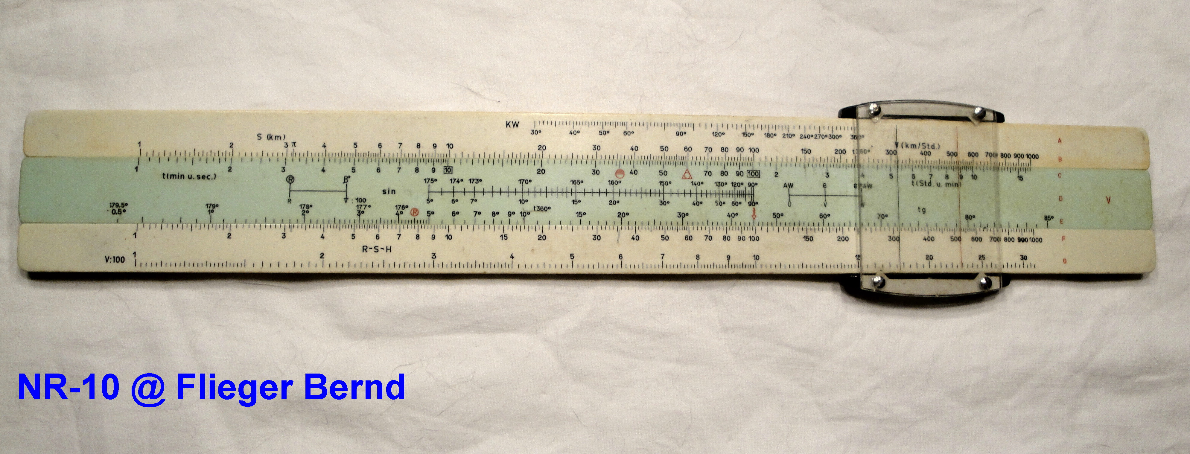 Ich habe mein Gerät auch mal hervorgesucht. Bei uns wurde immer vom NR-10 gesprochen, mußte jetzt aber feststellen, daß ich einen Navigat habe. Auf Bernd seinem Foto ist auch ein Navigat abgebildet. Erkenntlich an der Bezeichnung LG 357380 rechts unten in der Ecke. Benutzt wurde er nur zur nav. Vorbereitung am Boden. Zur Windberechnung (AW und w) vor dem Streckenflug haben wir die Rechenscheibe auf dem Knieplanchet benutzt, das ging schneller und war von der Genauigkeit ausreichend.