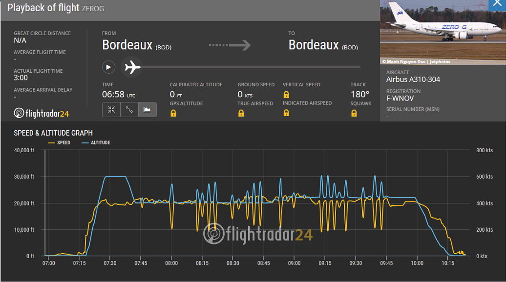"Es handelt sich um einen besonders exotischen Vogel: Der Airbus 310 mit Jahrgang 1989 hatte zunächst knapp zwei Jahre im Dienst der einstigen DDR-Airline Interflug gestanden. Danach wurde er zum Regierungsflugzeug «Konrad Adenauer» der Bundesrepublik Deutschland umgebaut. 2014 schliesslich ging der zweistrahlige Jet an die französische Firma Novespace, die ihn für wissenschaftliche Parabelflüge umrüstete. Novespace ist im Besitz der nationalen französischen Raumfahrtagentur Cnes, die europäische Raumfahrtagentur ESA ist Anteilseignerin."