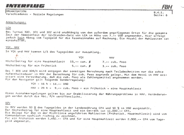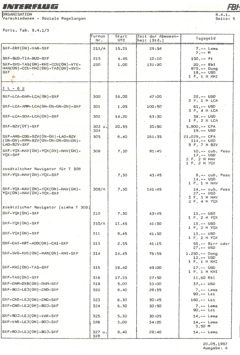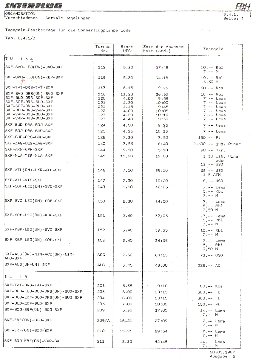 ...und siehe da, mal in meinen alten Unterlagen gewühlt und auch das entsprechende Material dazu gefunden. Ich hoffe es ist entsprechend leserlich und man gewinnt einen Eindruck zu den angeführten Tagegeldsätzen die nach Abwesenheit und Destination gezahlt worden sind. Diese waren für die Sommerflugplanperiode 1987 festgesetzt.