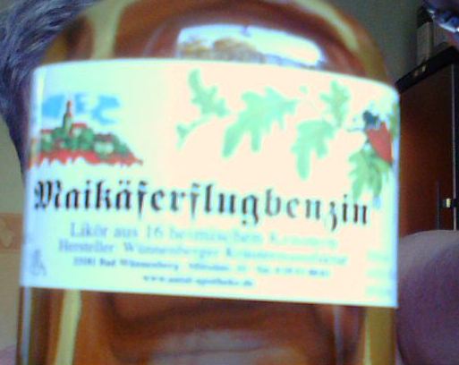 Allen Herren der Schöpfung einen schönen Feiertag. Meine Frau hat heute Frühdienst. Ich komme in die Küche um mir mein Frühstück zu machen.......... da steht eine Flasche Maikäferflugbenzin Super Bleifrei (Likör aus 16 heimischen Kräutern) - mit den besten Wünschen.