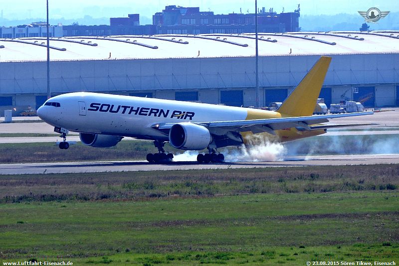 Schon im Zwielicht der untergehenden sonne schwebt Southern Air mit ihrer Boeing 777-200D N714SA ein.