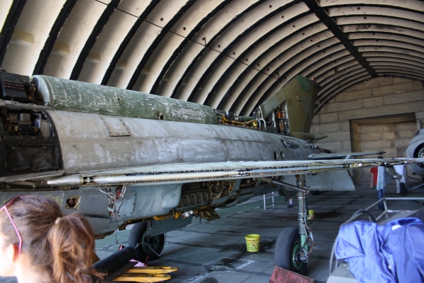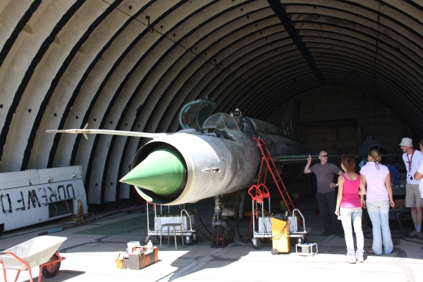 So Leute. Was sich dann ereignete, ist für mich immer noch kaum zu glauben. Ich hörte ein Turbinengeräusch. Da auf dem Platz gerade eine Motorsportveranstaltung stattfand, dachte ich, dass wohl jemand eine Turbine eines Kraftfahrzeuges laufen lassen hat. Weit gefehlt. Es war das Triebwerk DIESER MIG21. Wo sind hier eigentlich die in Flammen springenden Smileys?