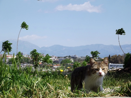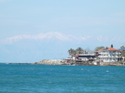 Ein paar Meter die Straße hoch,rechts und noch einmal "hinfallen" schon steht man an der Strandpromenade mit einem unbezahlbaren Ausblick auf blauen Himmel, türkisfarbenes Wasser des Mittelmeers und am Horizont die Ausläufer des Taurusgebirge.