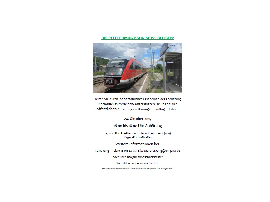 hiermit möchte ich alle die sich neben Luftverkehr auch für die Eisenbahn interessieren. Ganz herzlich für den 24.10.2017 um 16:00 Uhr in den Thüringer Landtag nach Erfurt einladen. Dort findet die öffentliche Anhörung zur Petition von BürgerInnen gegen die Abbestellung des SPNV auf der Pfefferminzbahn zwischen Buttstädt und Großheringen statt.