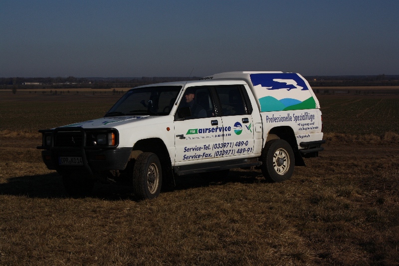 Als ich dann kurz nach 9 auf dem AFP dank übermittelter Koordinaten ankam, fand ich eine Reihe von agrarflugtypischen Landwirtschaftsfahrzeugen und eine Gruppe von Menschen vor, die offensichtlich dazugehörten. Doch es war weit und breit kein gelbes Flugzeug zu sehen und zu hören. Dazu ist zu sagen, dass ich bei solchen Gelegenheiten meist gut 20 Km vor dem Zielgebiet das Radio ausmache und beide Fenster runter(man könnt ja was verpassen…), was bei Temperaturen um den Nullpunkt ganz schön schattig werden kann.