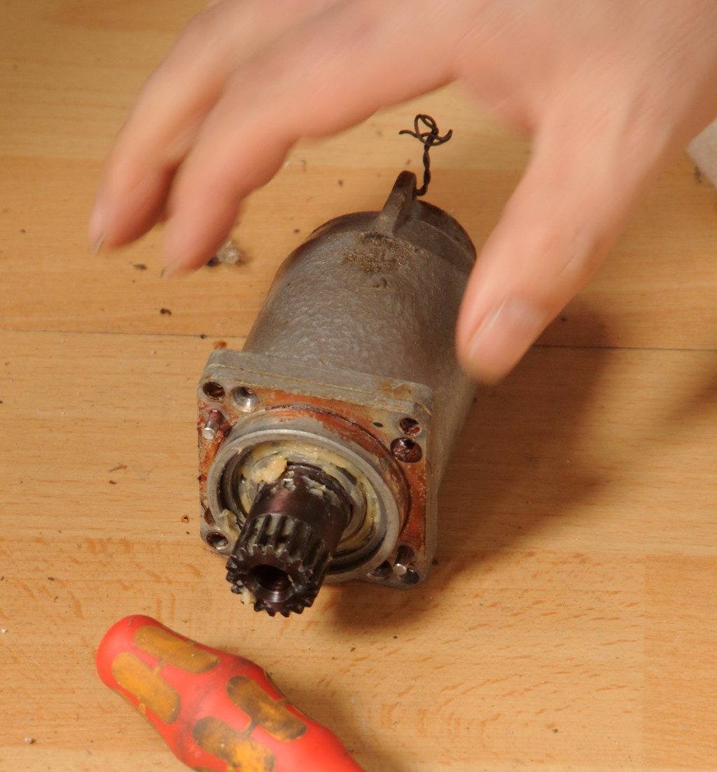 Na gut, dann nehmen wir den Antrieb mal weiter auseinander und recht haben wir: es gibt eine mechanische Hemmung. Allerdings ragt natürlich unser Torx-Einsatz als Ersatzkurbel nie und nimmer so weit in den Antrieb hinein, um auch die Hemmung zu beseitigen, Da bleibt nichts weiter, als die hemmenden Teile auszubauen.