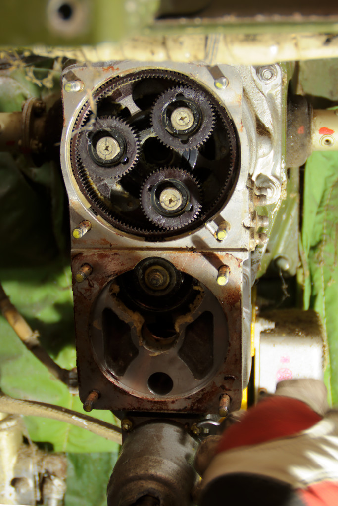 Nun also den Handantrieb wieder angebaut, aber die sinnreiche Konstruktion des Getriebes gestattet die Bewegung der Antriebswellen mit zwei Motoren, im Versagensfalle auch mit einem oder auch mit dem Handantrieb. Allerdings müssen alle Antriebe im Getriebe eingesteckt und die nicht funktionierenden arretiert sein, sonst ist der Kraftfluß unterbrochen. Also schnell die beiden Motoren wieder einbauen...