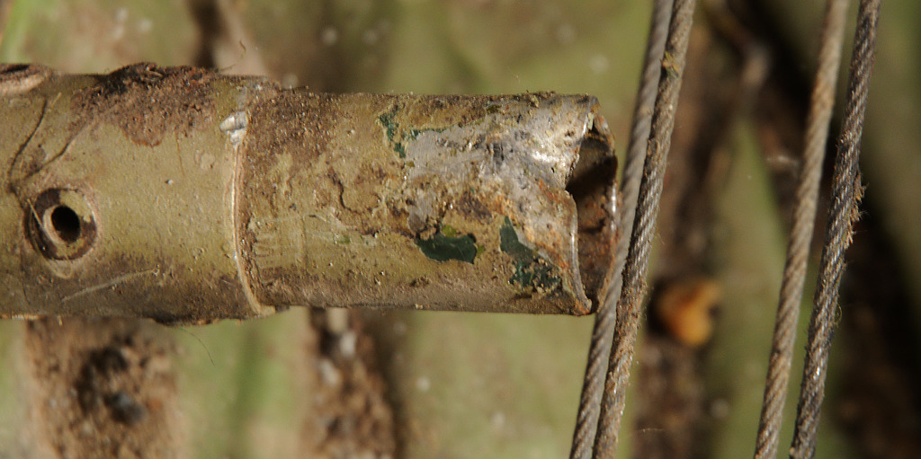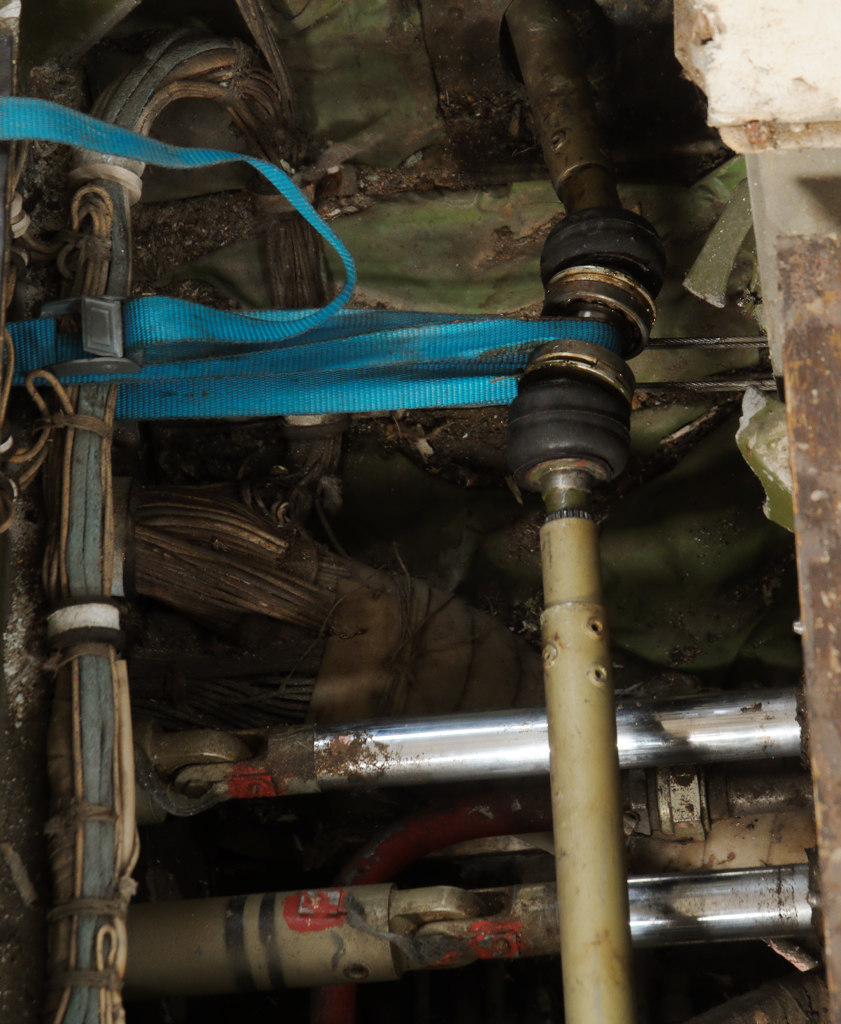 Wer nun glaubt, die Kurbelei könne beginnen, hat die Rechnung ohne das Vorleben der Tu gemacht. Eine der beiden Antriebwellen, die den Antrieb mit den Klappen verbindet, ist verbogen und der Lagerbock, der an der Zelle anontiert war ist abgerissen. Welche Gewalten wo da auch immer gewirkt haben, entzieht sich unserer Vorstellungskraft. Die vormaligen Nutzer waaren dies höchstwahrscheinlich nicht und beim Transport übers Feld auf den jetzigen Standort ist es wahrscheinlich auch nicht passiert. Wann aber dann? Wir wissen es nicht. Aber den Salat haben wir trotzdem. Die Welle, die durch die Hermitikdurchführung läuft, ist an der Stirnseite nicht nur eingebeult, sondern auch fast viereckig. Ein Richten vor Ort erwies sich als unmöglich, da blieb nur noch die Flex, um die Anschlußseite ein wenig zu kürzen. Den zerstörten Lagerbock ersetzte das blaue Band der Sympathie, und dann konnte die Kurbelei endlich losgehen.