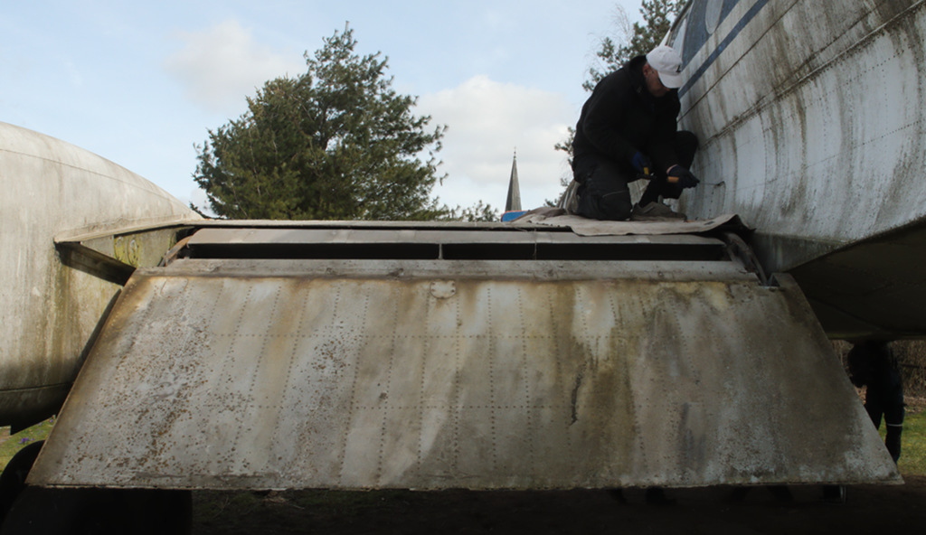 Die neue Aufgabe in vier Metern Höhe - die Spaltverkleidung am Seitenleitwerk.