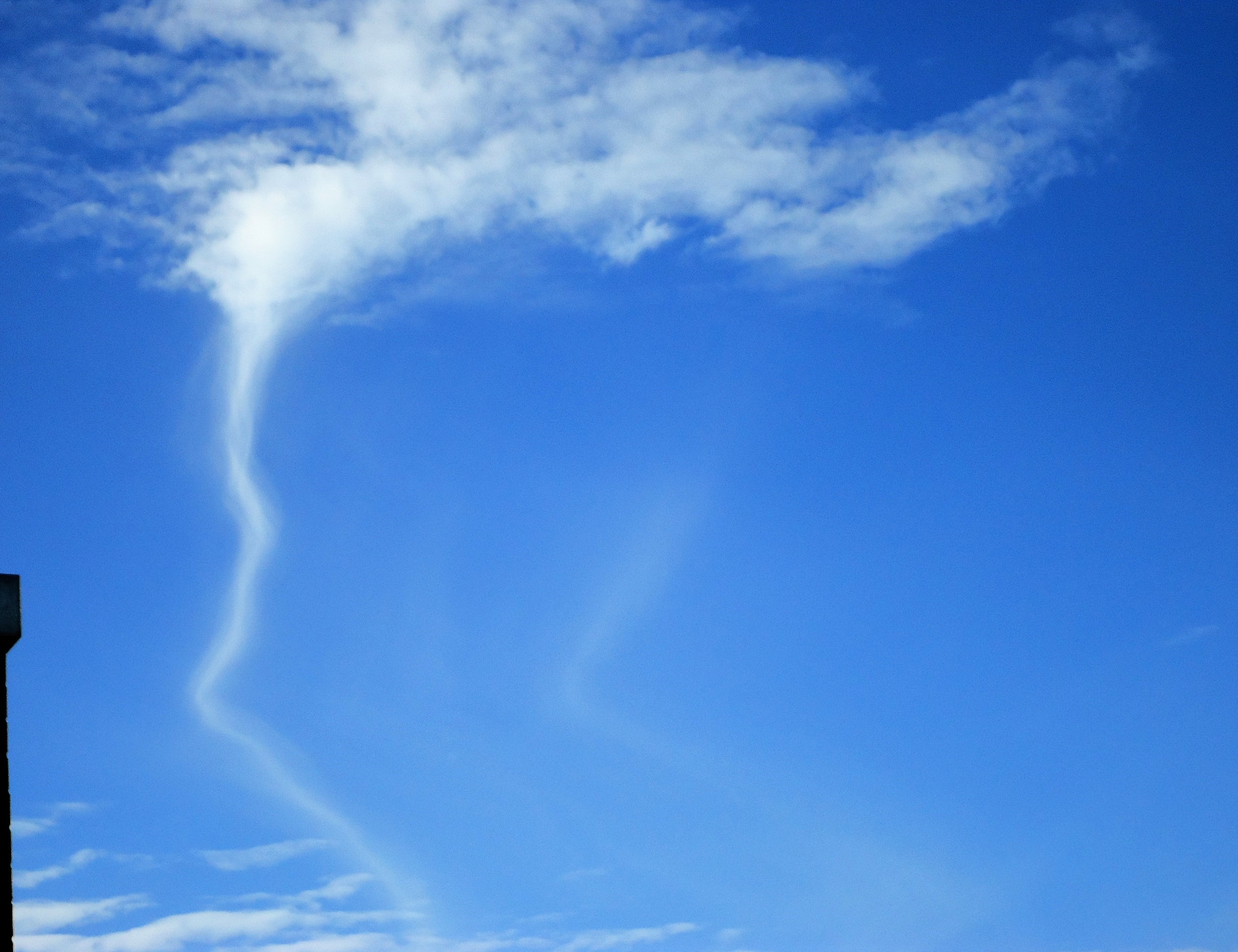 Es scheint eine mittelhohe Wolkenbildung zu sein, aus der sich die schlauchartige Formation bildet, die vermutlich keine vertikale Komponente hat.