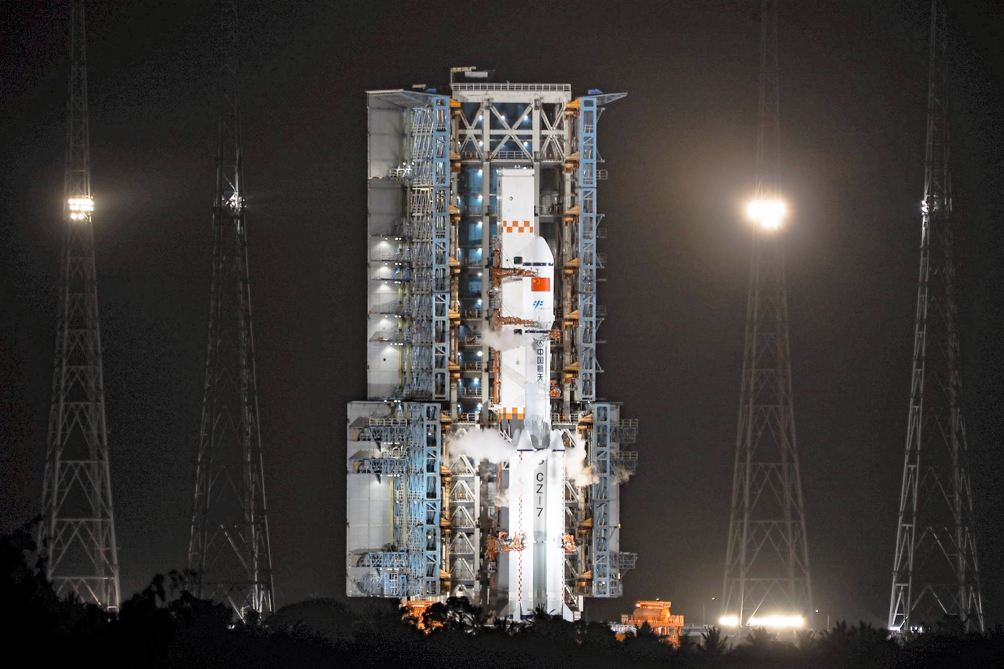 Der Serviceturm ist zurückgefahren, die CZ-7 startbereit auf dem Launch am Versorgungsmast