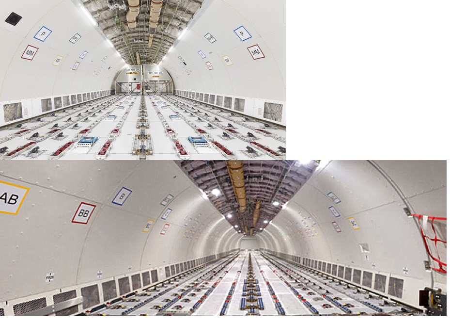 Hier mal die Ansicht des Frachtladesystems eines umgebauten A330 P2F / unten A330F von Airbus