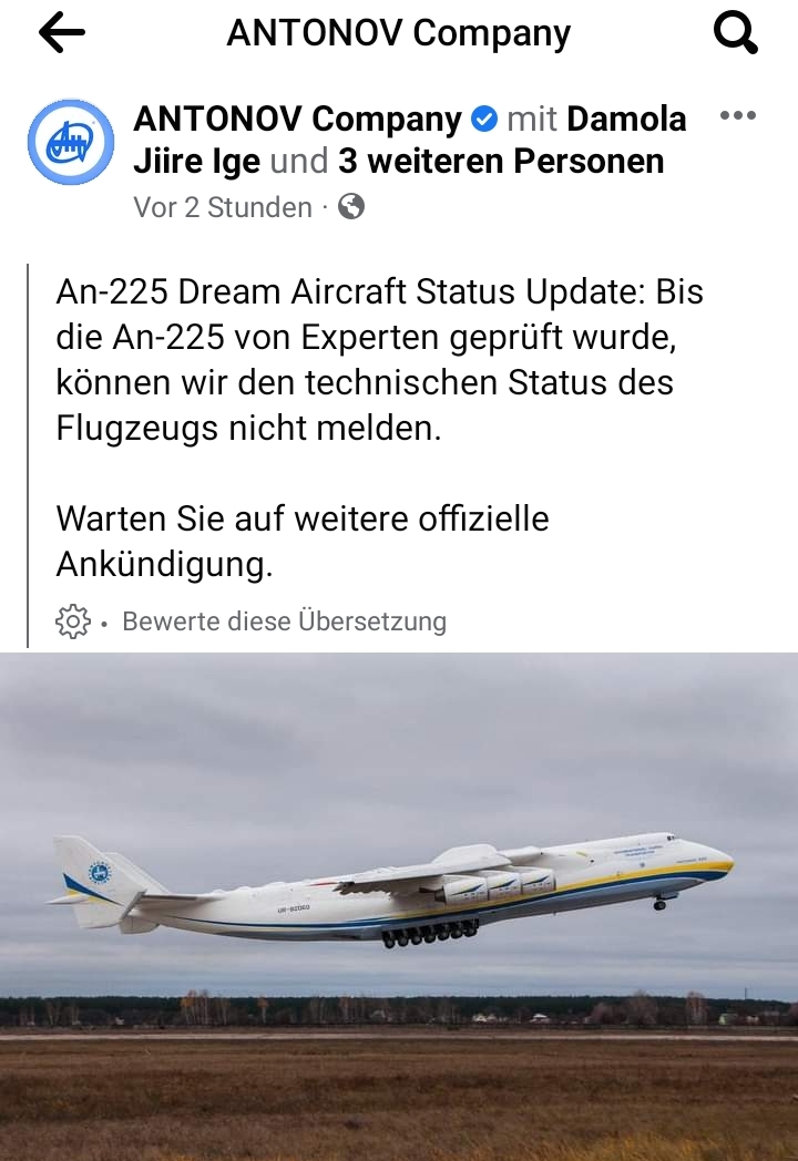 Also, die Ukrainische Prawda bestätigt mit Verweis auf Antonow-Mitarbeiter die Zerstörung der AN-225 beim 5.Angriff auf den Flughafen Gostomel.