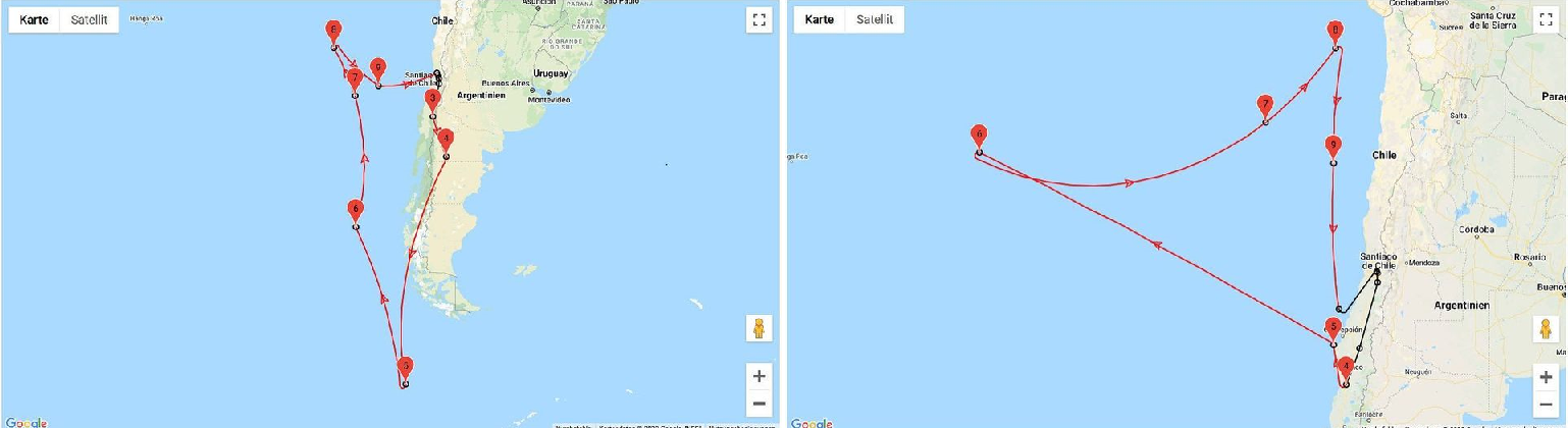 Links war der wissenschaftliche Beobachtungsflug von gestern - rechts der Plan von heute zu morgen als Vorletzter der Kampagne Chile