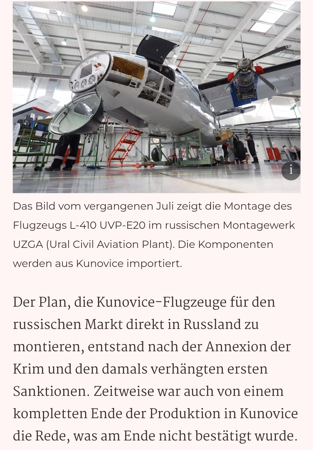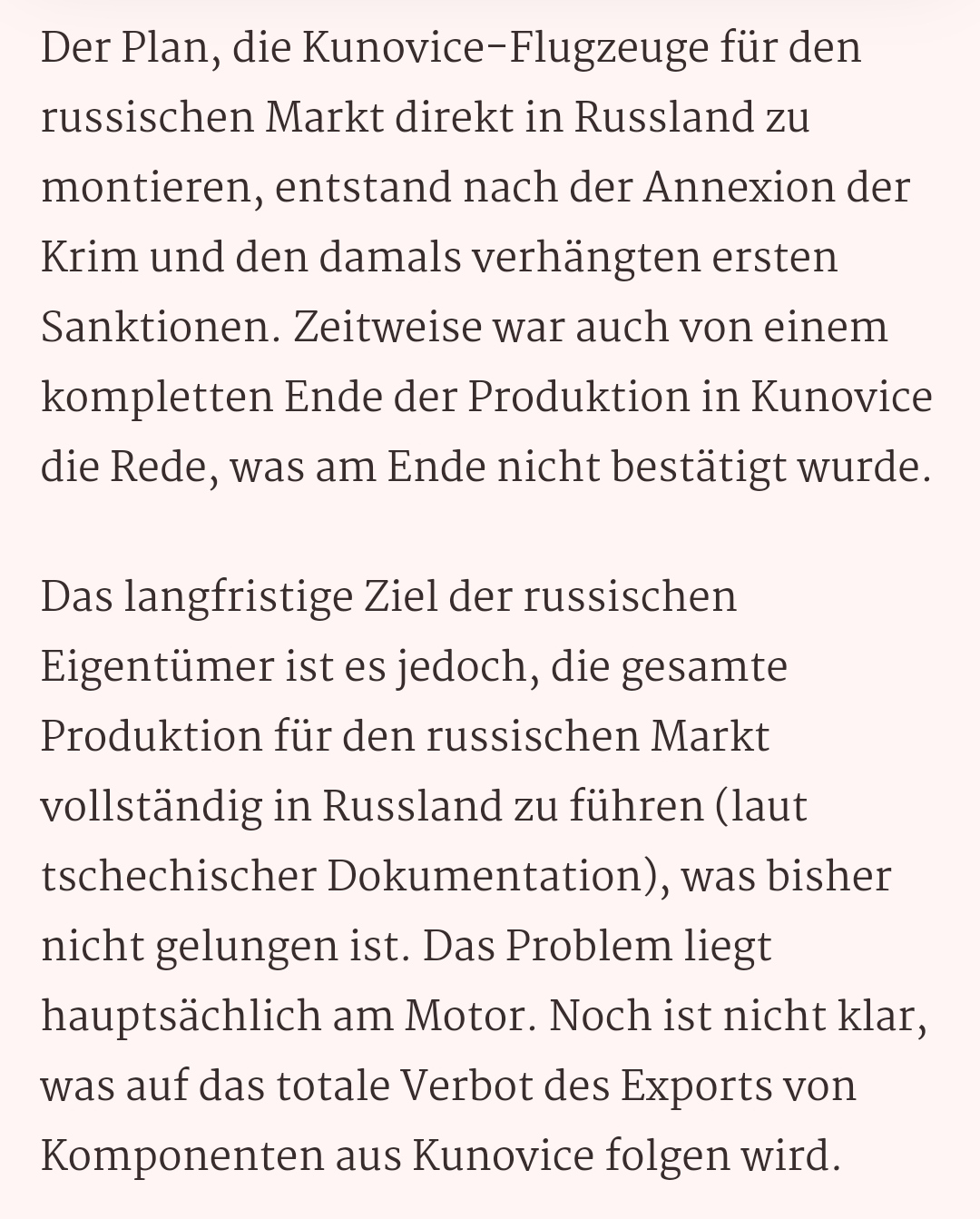 Der Grund, das die Tschechische Omnipol die Firma Aircraft Industrie aus russischen Besitz zurückgekauft hat, ist nicht allein darin begründet, die Firma von Sanktionen gegenüber Russland zu bewahren. Der Hauptgrund ist eher, das im Flugzeugtypen LET L-410UVP-E20 und noch viel mehr im L-410NG viel zu viele westliche Komponenten verbaut sind. Selbst dann, wenn man das Flugzeug in Russland bauen würde. Damit ist die L-410 für Russland keine Option mehr. Zumindest keine, die förderungsfähig ist. Das bedeutet natürlich auch das aus der auf der tschechischen L-610 basierenden TVRS-44 "Ladoga".