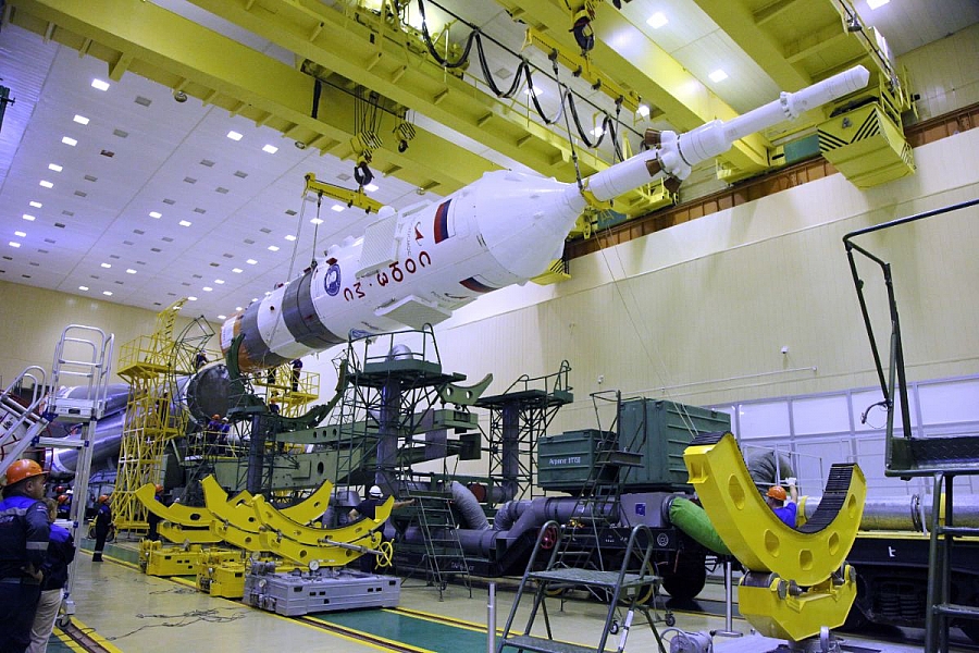 Nach dem Pressedienst Roskosmos wurde heute im Montage- und Testgebäude des St.-Ortes 31 des Kosmodroms Baikonur die Generalmontage des Sojus-2.1a- Trägers mit dem bemannten Raumschiff "Sojus MS-22" Namens K.E. Ziolkowski durchgeführt