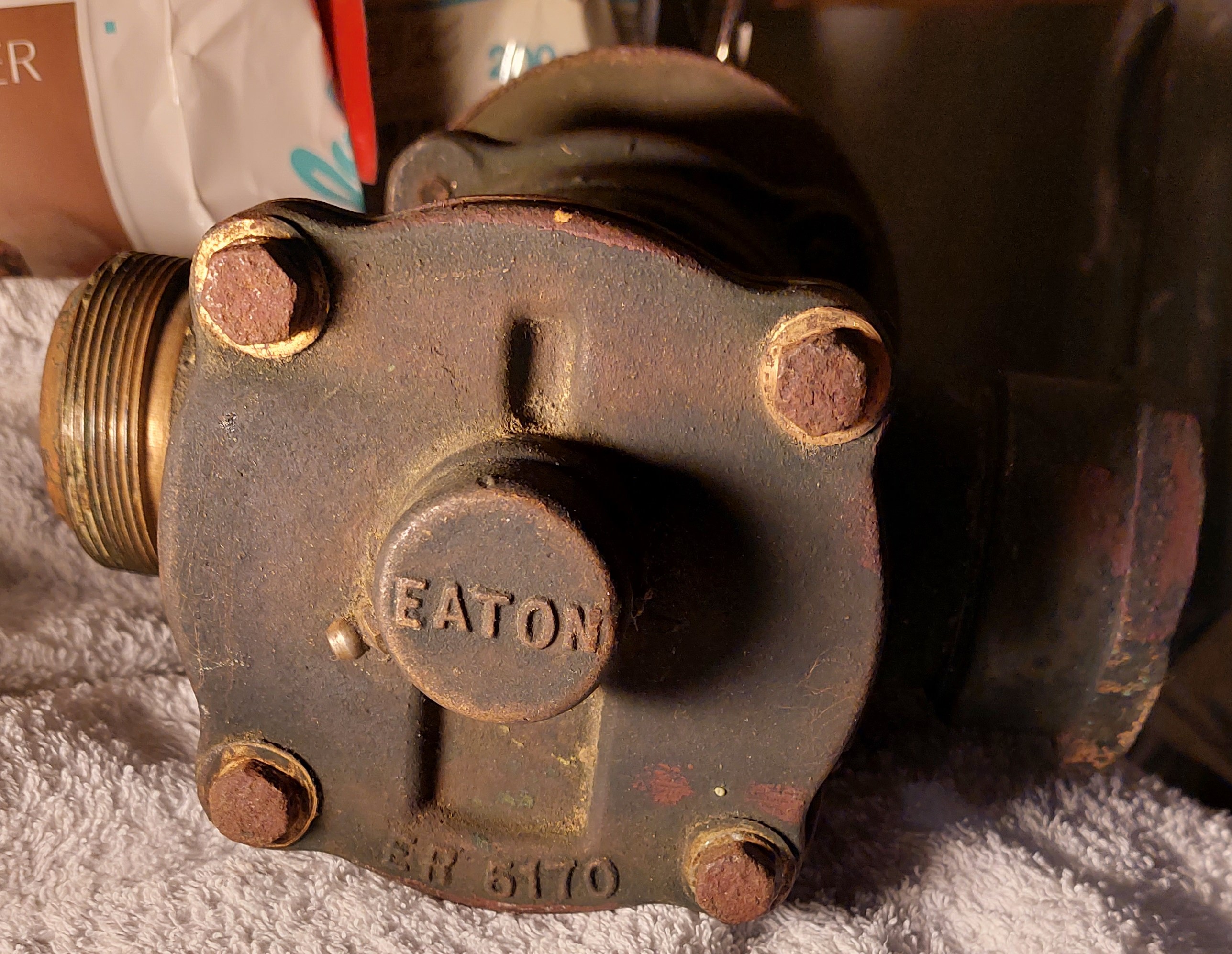 Eaton baut zwar Pumpen und Hydraulik-Komponenten auch für die Luftfahrt, aber dieses Teil sieht nicht danach aus. Es fehlt ein Typenschild, die Schraubverbindungen sind ungesichert (keine Vorkehrungen für Sicherungsdraht) und der Antrieb mittels Seil- oder Riemenscheibe ist auch untypisch.