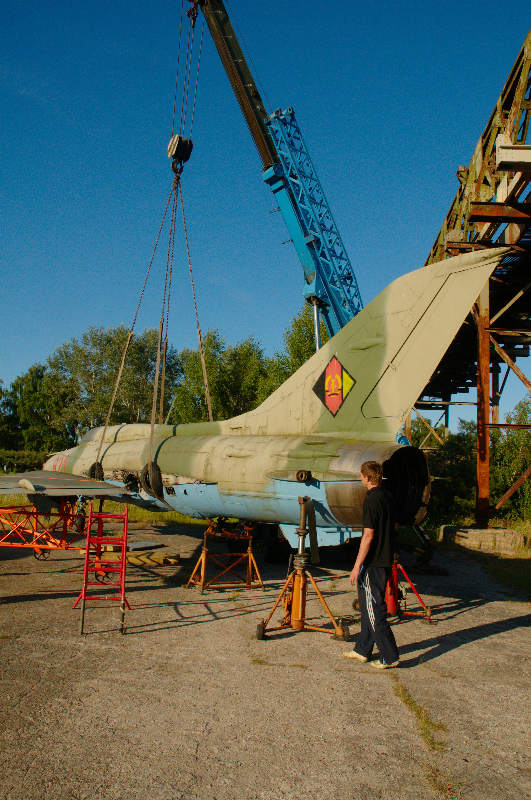 Der (ungleich leichtere) Rumpf der MiG-21 schwebt am Haken