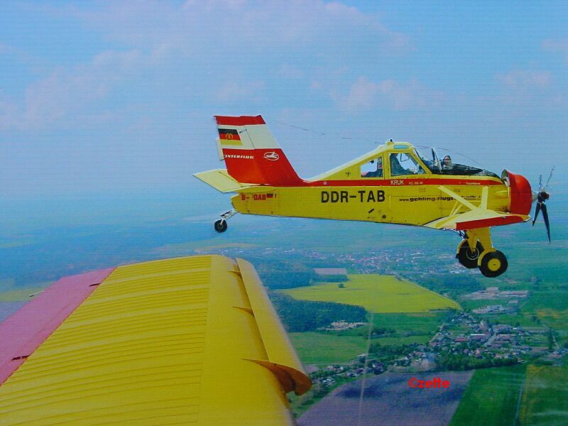Auch ich mache mich auf den Heimweg. Das Gepäck ist im Kofferraum verstaut und da der Sprit in Stendal etwas günstiger ist als auf der Heimatbasis mache ich noch einen Abstecher nach Stendal zum tanken. Auf dem Kurs Richtung Kyritz erhasche ich 50m unter mir die Kruk von Dieter Gehling. Mein Blutdruck ging hoch, nicht nur wegen des Anblicks, sondern weil ich auch die Kamera gut verstaut hatte. Dieter war auf dem Weg zum Tanken nach Stendal und ich konnte es mir nicht nehmen lassen in abzufangen und wenigstens den Anblick im Paarflug für einen Moment zu genießen.